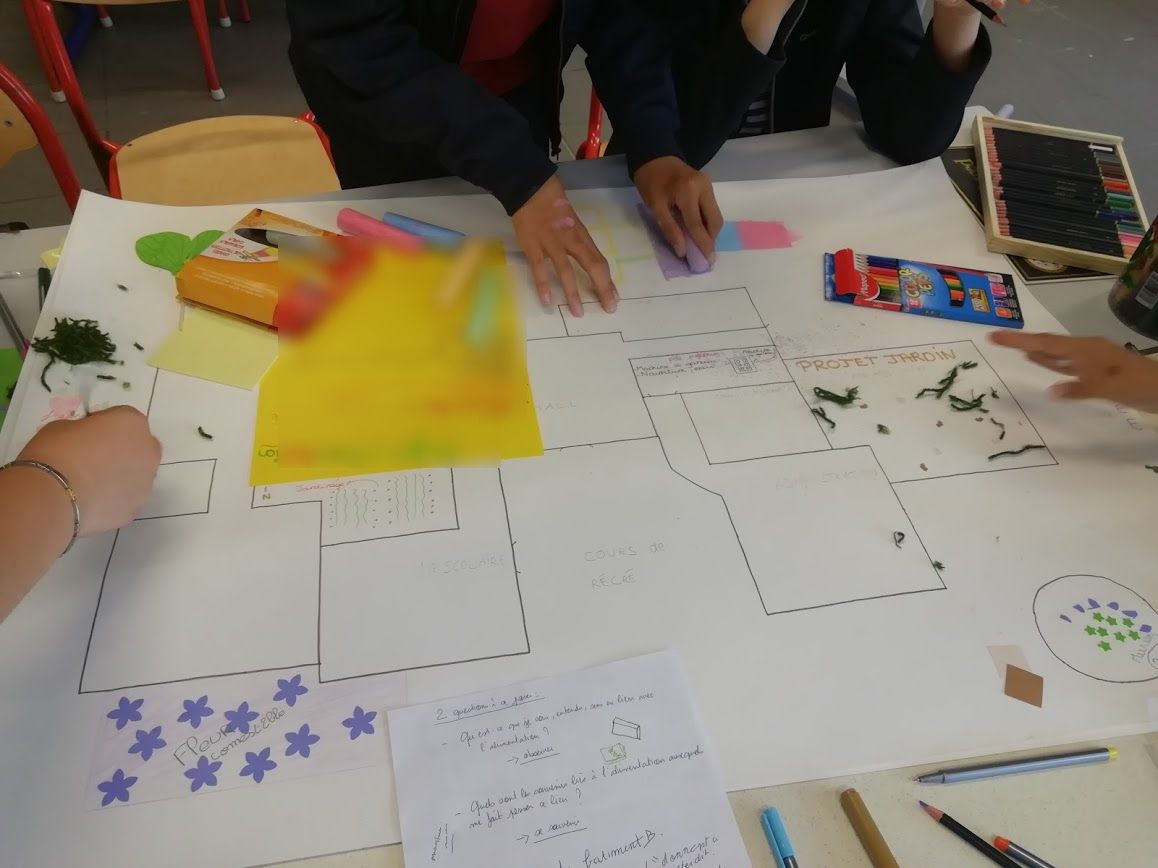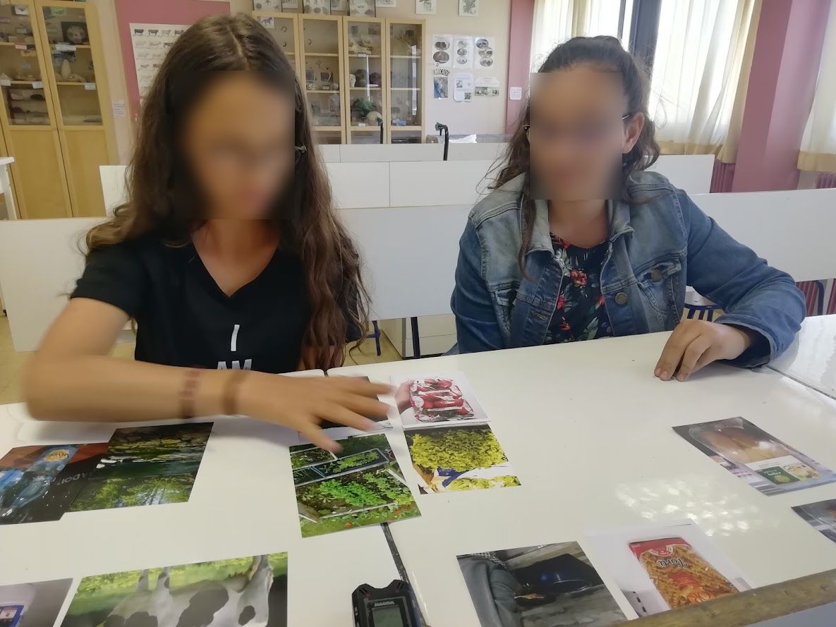 Ateliers de collecte de données avec des élèves de 5ème dans les deux collèges français étudiés : en haut, les élèves réalisent une carte sensible à partir de leurs observations de l’environnement alimentaire de leur collège. En bas, deux élèves commentent des photos des espaces liés à l’éducation à l’alimentation dans leur collège (photos : Alexandra Pech)
