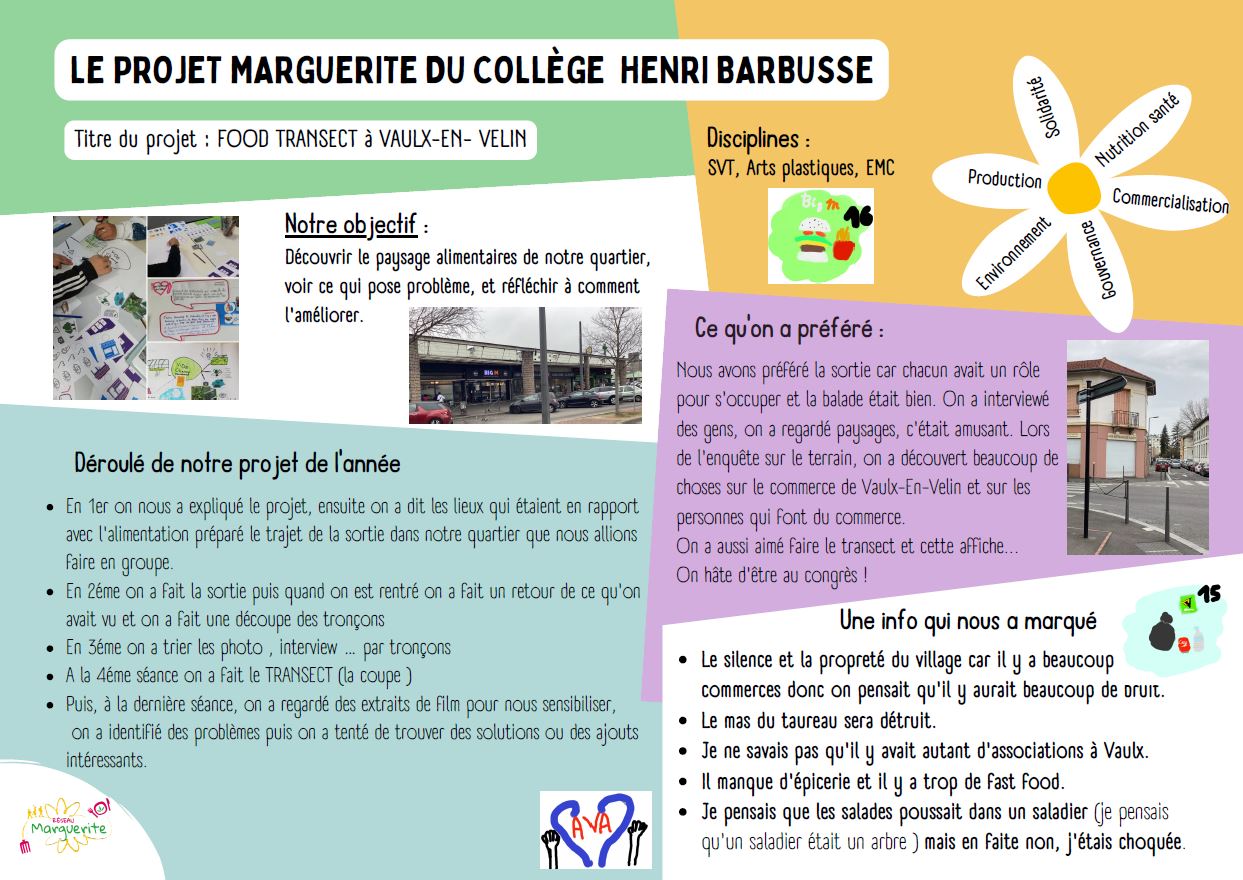 Le collège Barbusse mène cette année un projet de Food Transect* avec l’association Les robins des villes. Un projet réalisé avec une classe de 4ème (qui avait déjà mené un projet Marguerite en 5ème). En SVT, la classe travaille notamment sur les terminaisons nerveuses et la Zone à Faible Emission et la végétalisation des villes. En arts plastiques, elle travaillera sur l’architecture urbaine.
