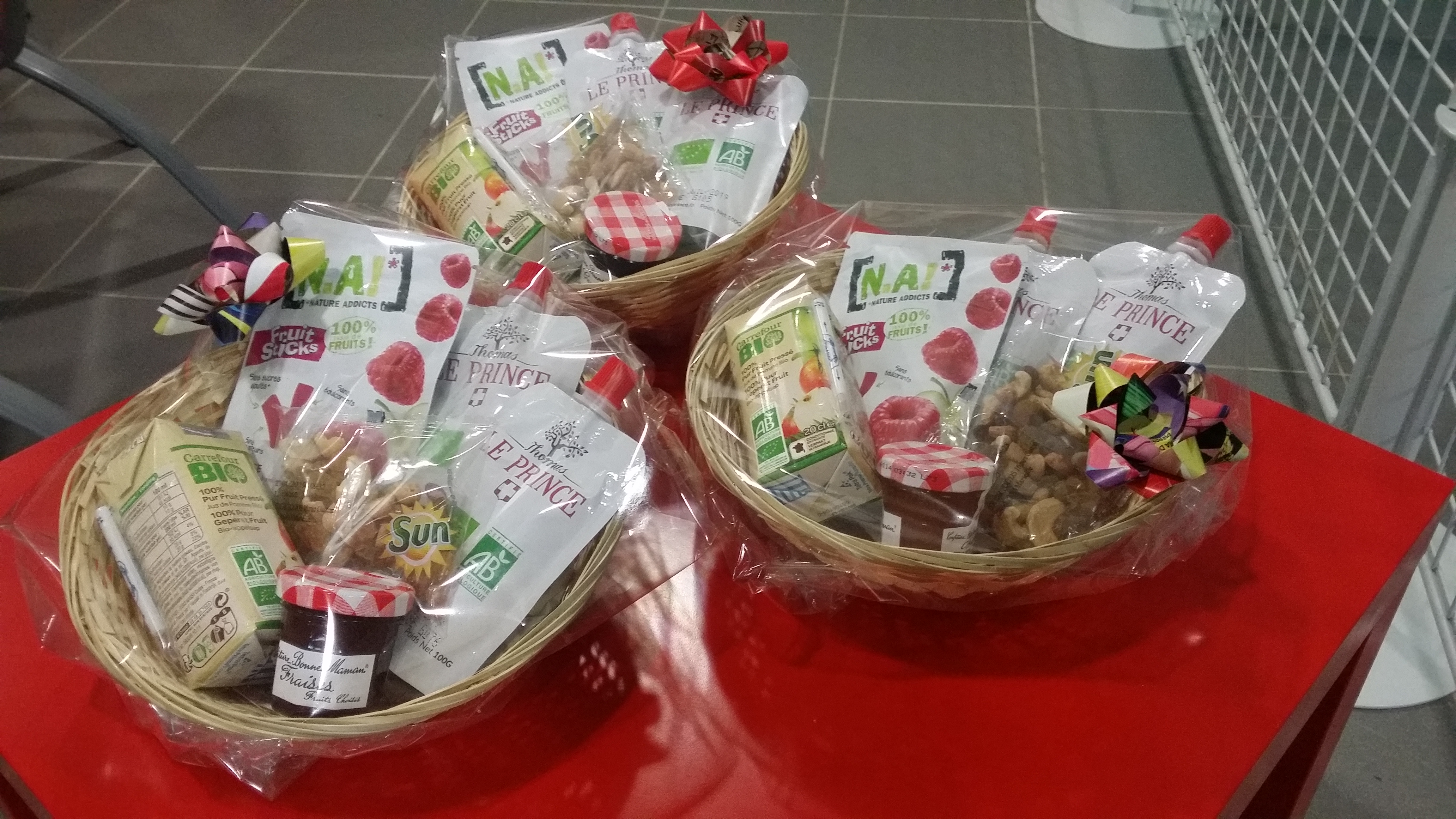 Jus de fruits, Gobelets carton compostables 10 cl (3 par participants), Colorant alimentaire (dont la référence est connue) ou couvercle afin de masquer le jus de fruit, Lots (paniers garnis de produits "sans sucre ajouté" et si possible locaux ; il est possible de faire appel à des producteurs locaux qu’ils fournissent des échantillons)
