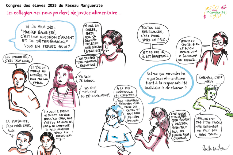 L’atelier “enquête sur les collégien·nes et la justice alimentaire” illustré en direct par une facilitatrice graphique Léah Touitou, proposait aux élèves de réagir par des émotions à des constats sur les questions de justice alimentaire et d’exprimer leur approbation ou désaccord, amenant à des débats entre élèves.