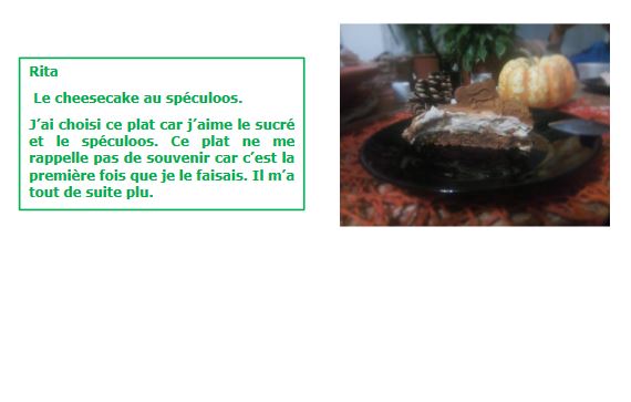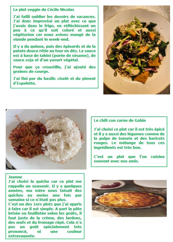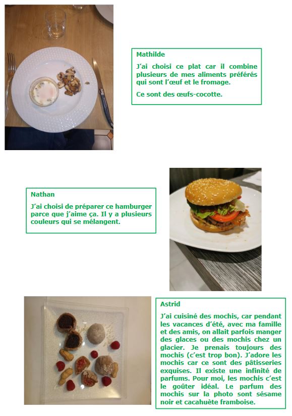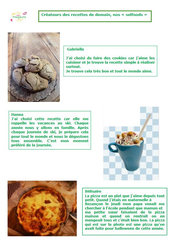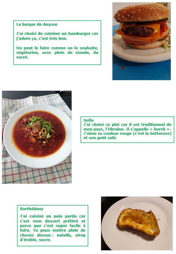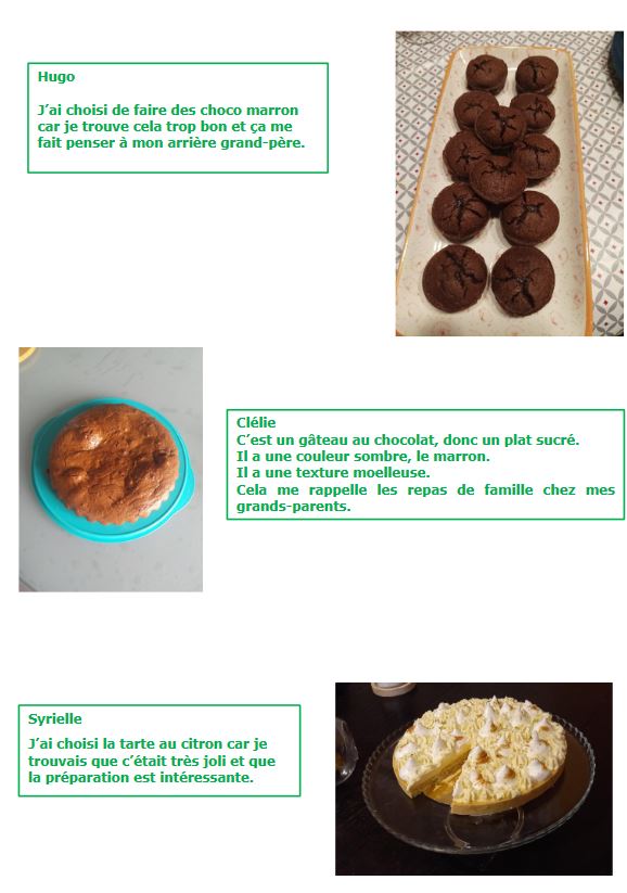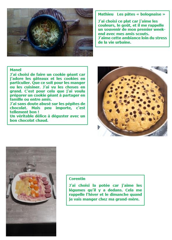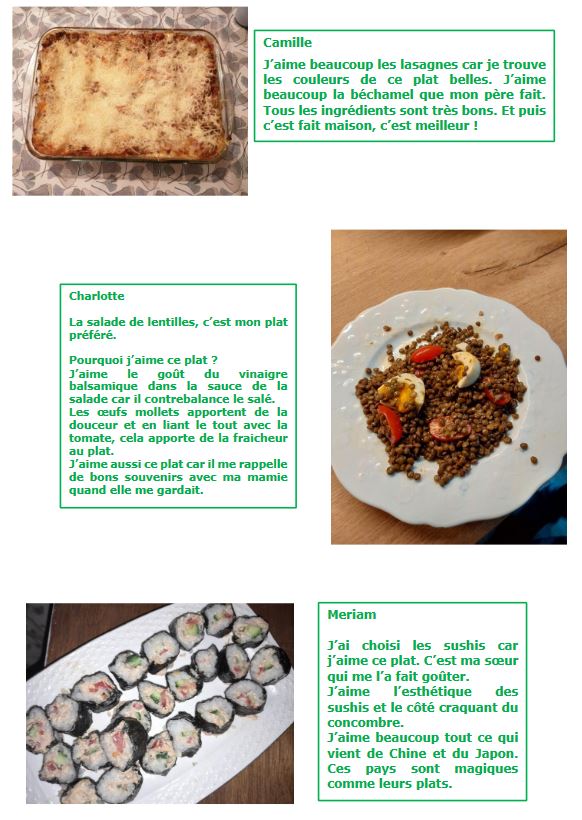 La consigne donnée était la suivante : « Mon selfood » Prends une jolie photo de ton plat préféré (sucré ou salé) que tu auras cuisiné et rédige quelques lignes qui justifient ton choix (son goût, un souvenir, un rêve…).