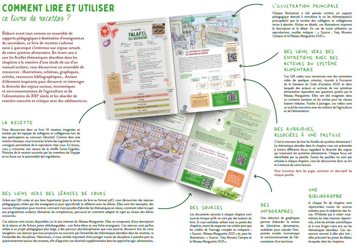 Le livre de recettes transformatrices du territoire est un livre-outil, fruit d’une méthodologie affinée au long de différents projets Marguerite, créé par et pour des adolescent.es, et dont l’idée est née de 2 concours de cuisine inter-collégiens : les Véni’chefs.
