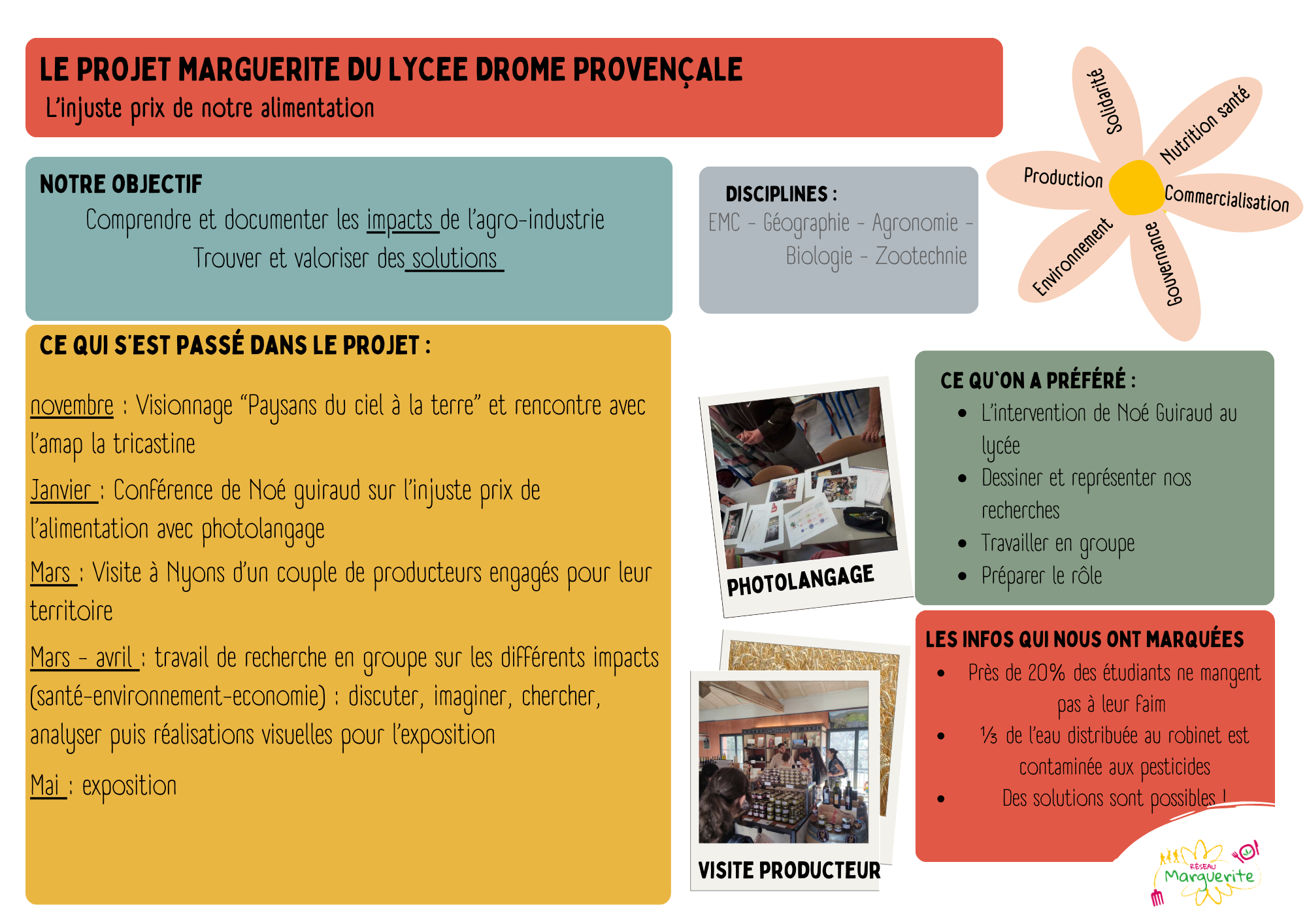Le lycée Drôme Provençale est le premier établissement drômois à intégrer le réseau Marguerite, et aussi le premier lycée agricole. Situé en zone rurale, naturellement tourné vers la connaissance de l’agriculture et de l’alimentation, les projets Marguerite se déroulent dans les classes de 1ère et Terminale STAV (Bac Sciences et Technologies de l’Agronomie et du Vivant) option Production.