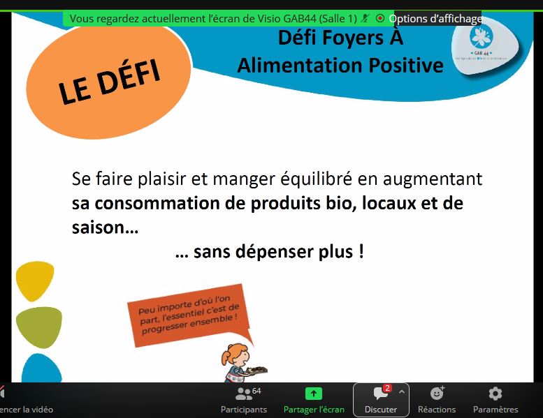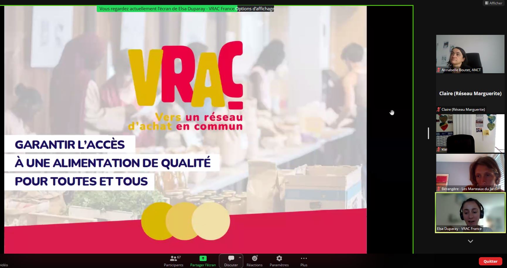 Devant une soixantaine de connecté.es en visio, Noémie a donc présenté l’historique du Réseau, notre principe d’action et quelques projets portés par des collèges en QPV. S’en sont suivis des échanges et des présentations d’autres acteurs tels que VRAC et les défis Foyer à alimentation positive portés par les GAB.