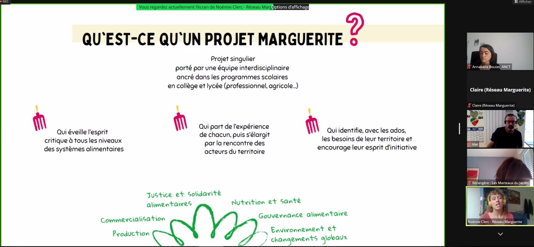 C’était mardi 27 Juin, le Réseau Marguerite était invité par l’ANCT à partager son expérience lors d’un webinaire intitulé "Éducation et sensibilisation vers une alimentation durable et de qualité".